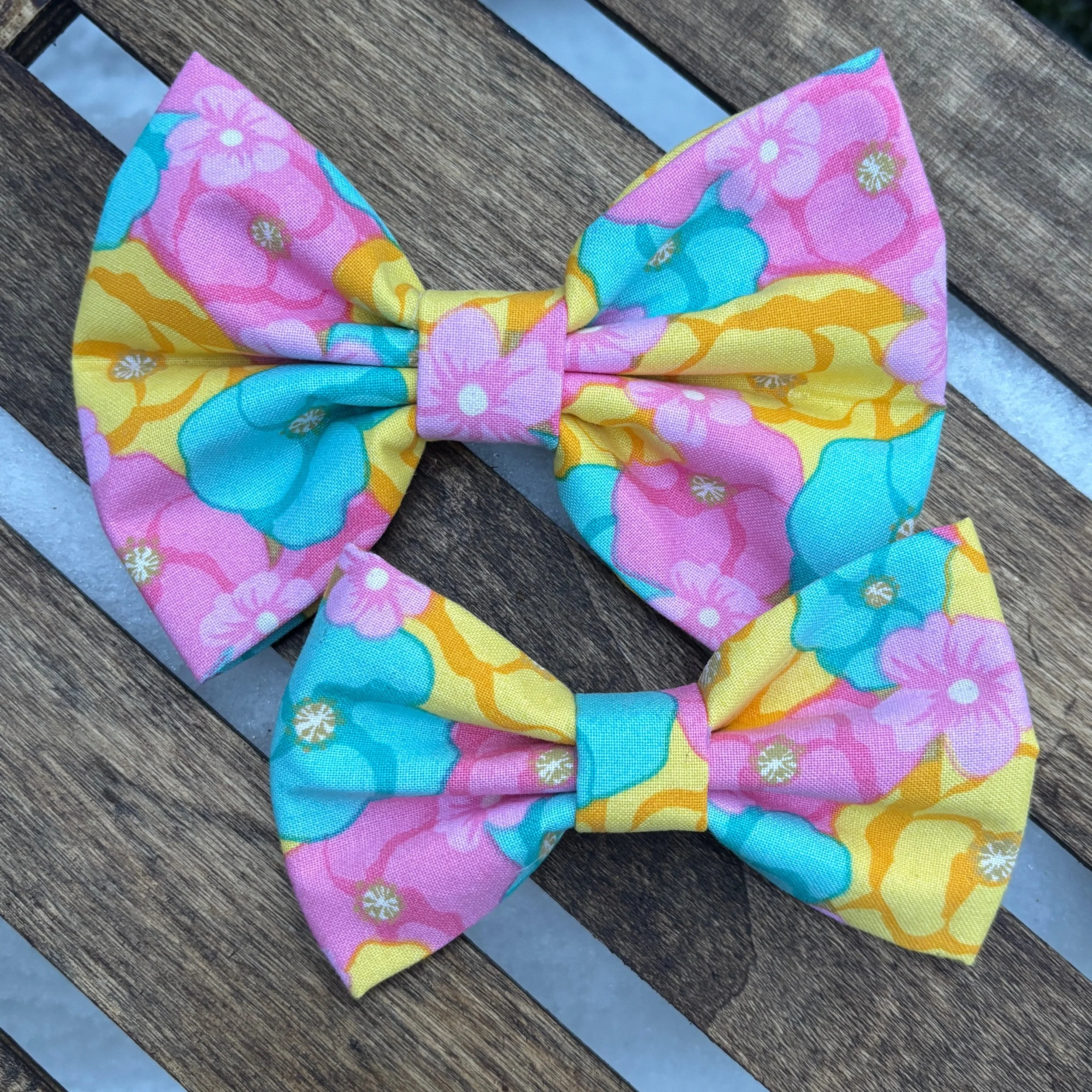 Slides on to the collar with 2 elastic bands that help secure the bow and avoid drooping.